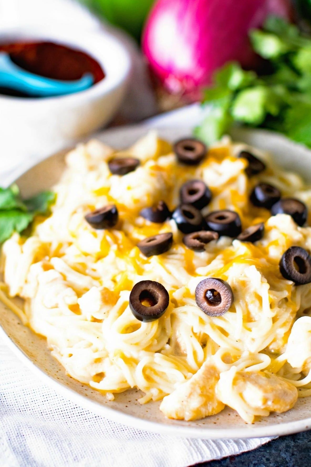 White Chicken Enchilada Pasta Recipe ~ A Pasta Recipe Loaded with the Flavors of White Chicken Enchiladas like Green Chiles, Black Olives, a little sour cream, and melted jack cheese!