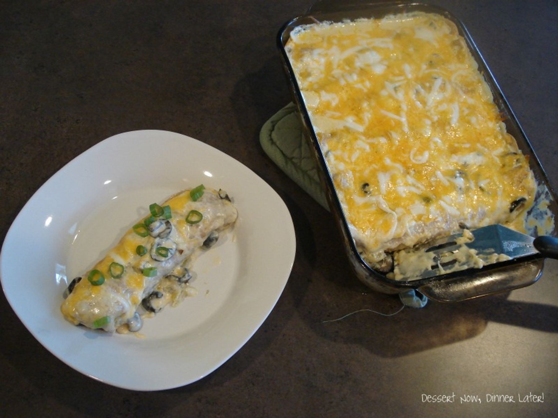 In a bowl, mix soup, sour cream, sauteed onion, chiles, olives, & 1/2 cup of each cheese. Set aside remaining cheese. Divide the sauce mixture in half & separate into two bowls. (One bowl for filling,...