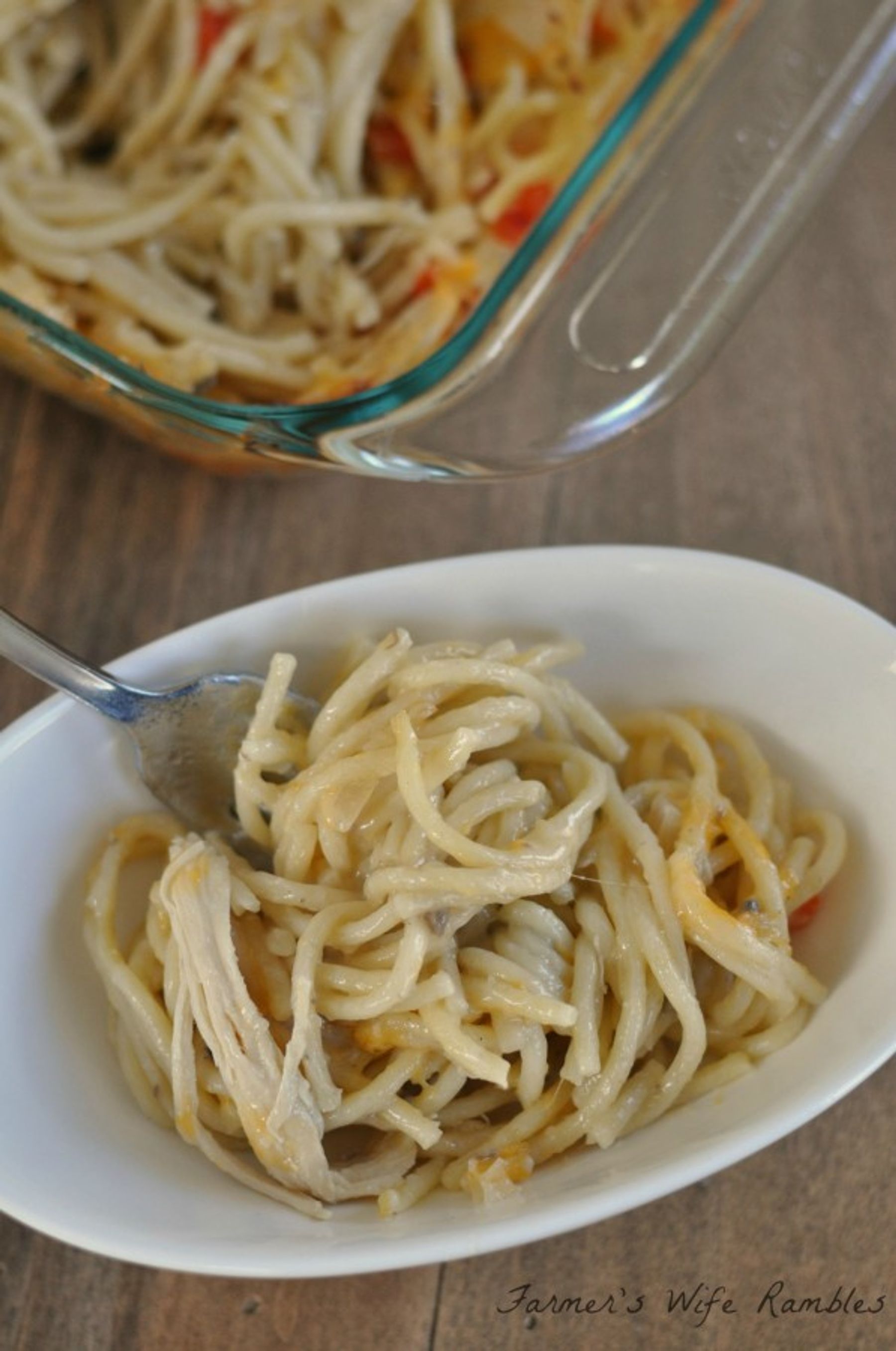 This recipe for White Chicken Spaghetti Bake will make two 9×13 pans. Serve one for dinner and freeze the other one or give one to a new mom.