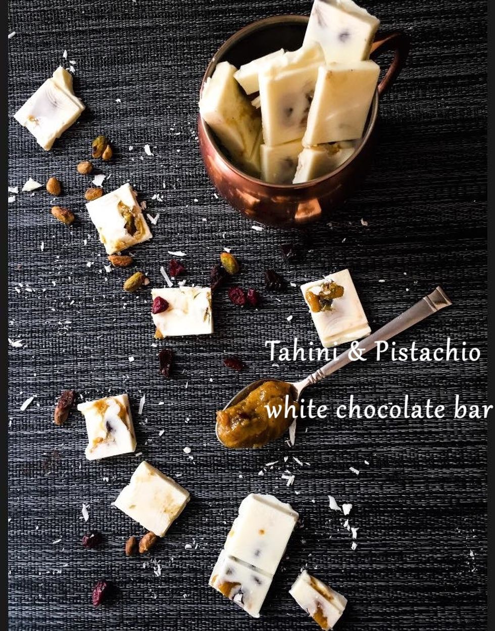 White chocolate bars with Pistachio,tahini&orange filling
