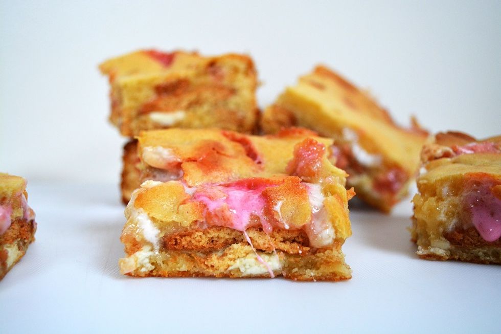 Gooey white chocolate slice with a layer of white chocolate buttons, marshmallows and graham crackers running throughout the middle.