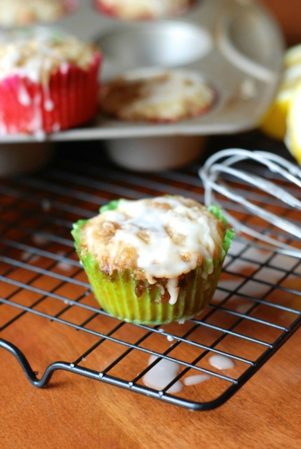 A tart lemon muffin sweetened with white chocolate chips and topped with a macadamia nut streusel and a simple lemon glaze.