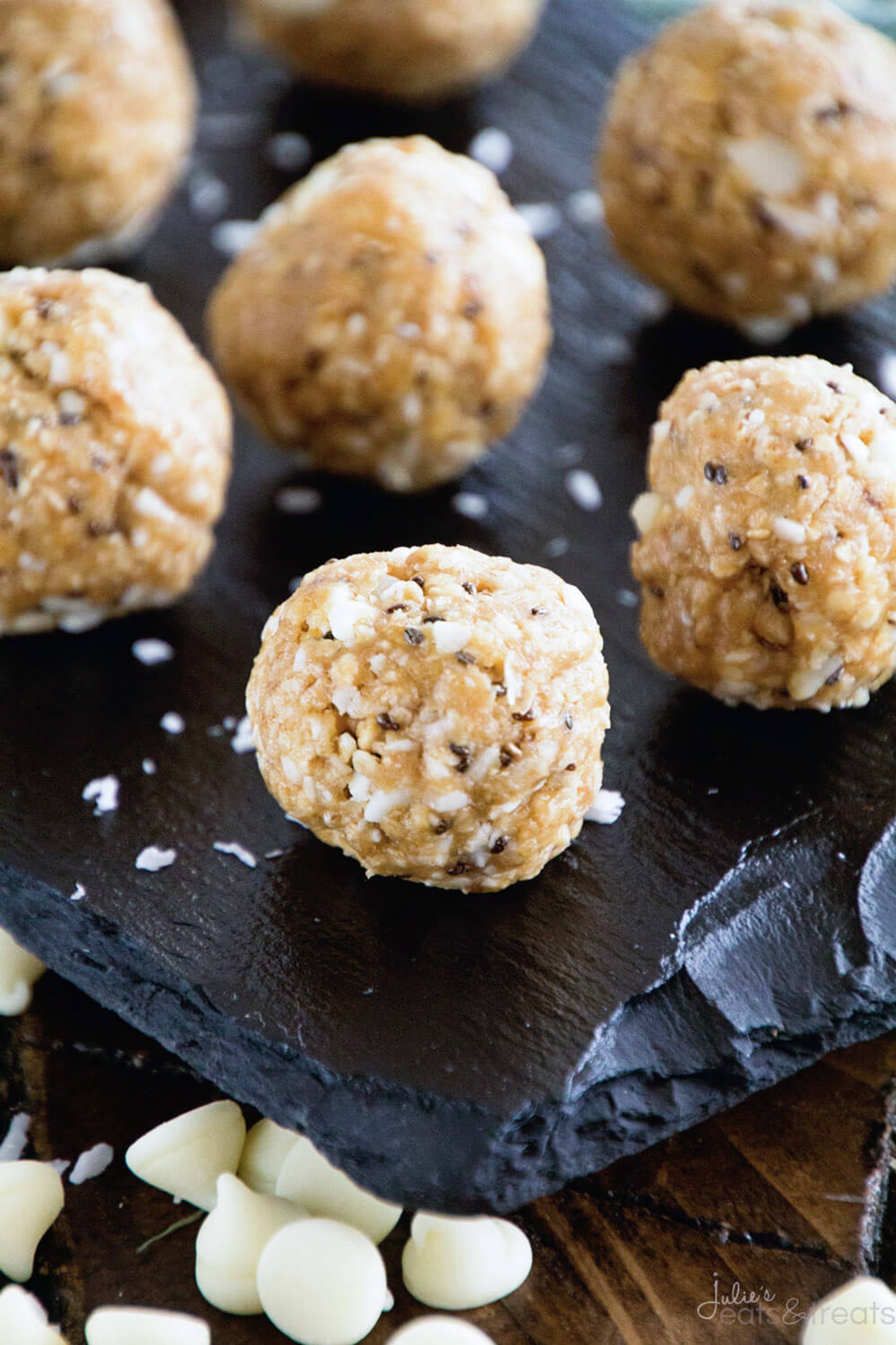 White Chocolate Macadamia Nut Energy Balls ~ Delicious Recipe for Energy Bites Loaded with White Chocolate Chips, Macadamia Nuts, Coconut, Oats, Flaxseed and Chia Seeds!