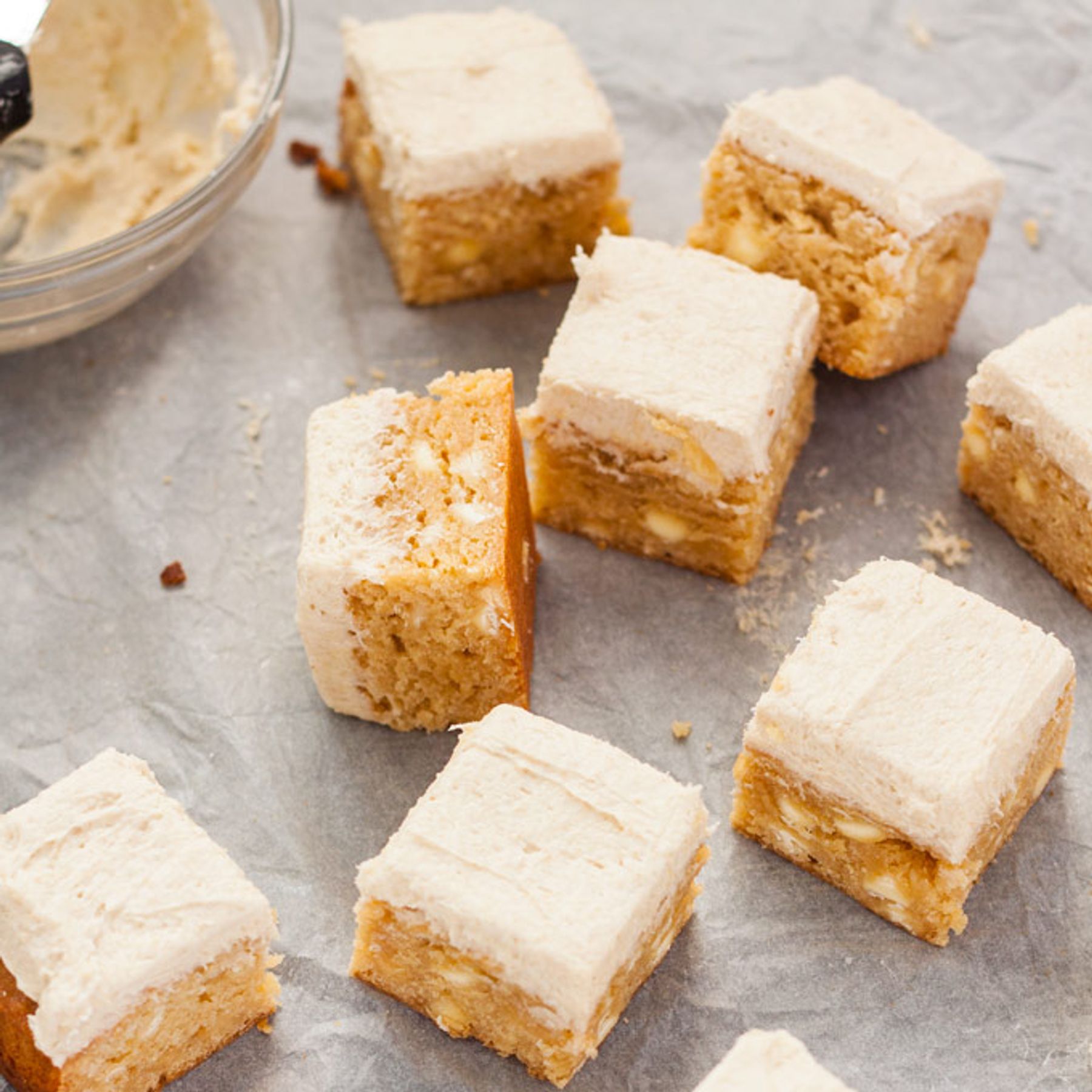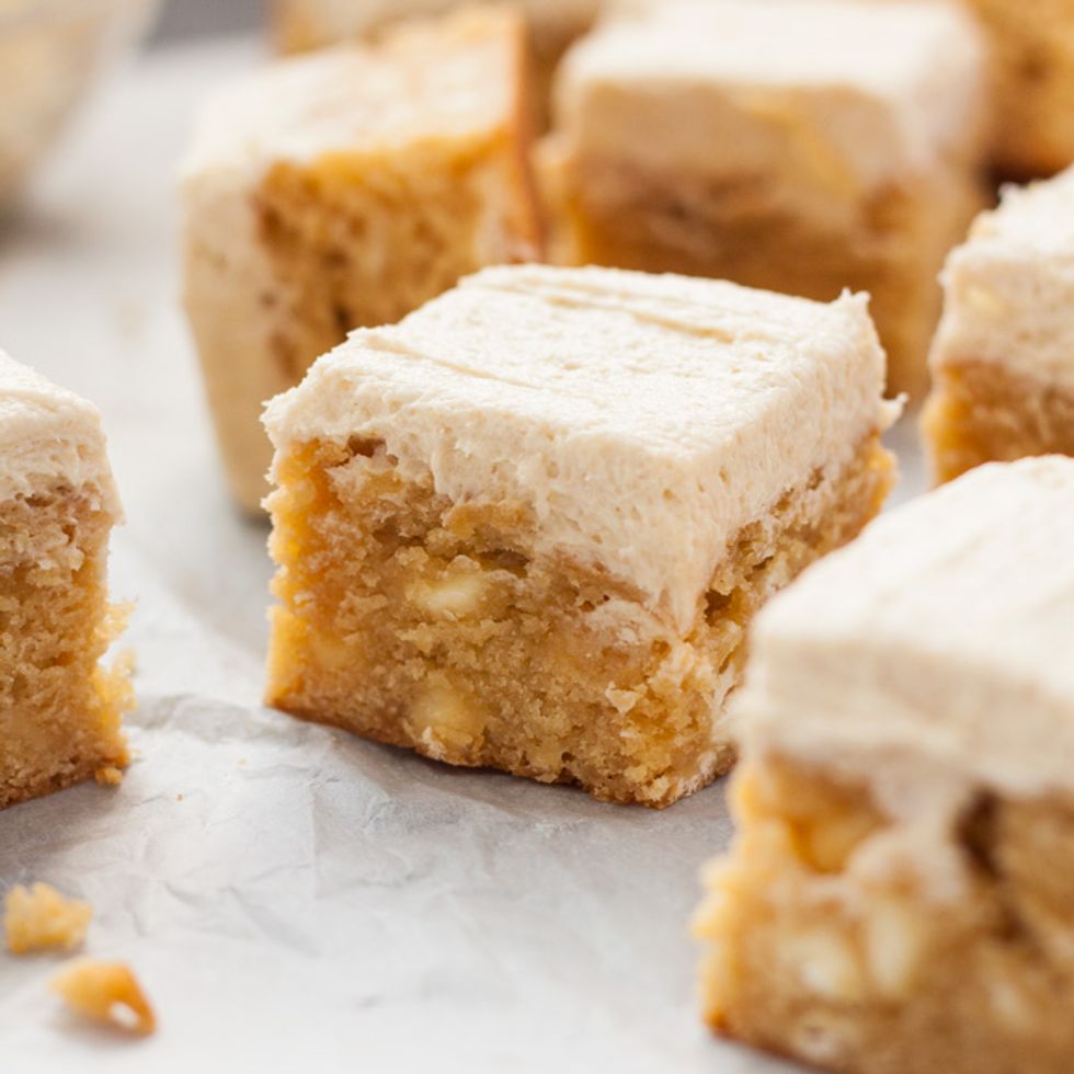 White Chocolate Malted Milk Blondies- dense, fudgy blondie filled with white choc chips and malted milk buttercream.