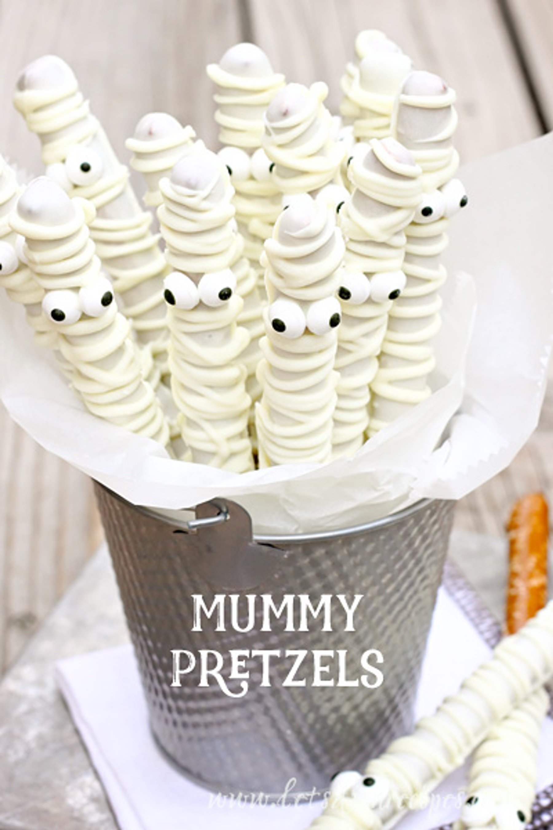 Pretzels rods covered in white chocolate to look like mummies. Perfect for Halloween!