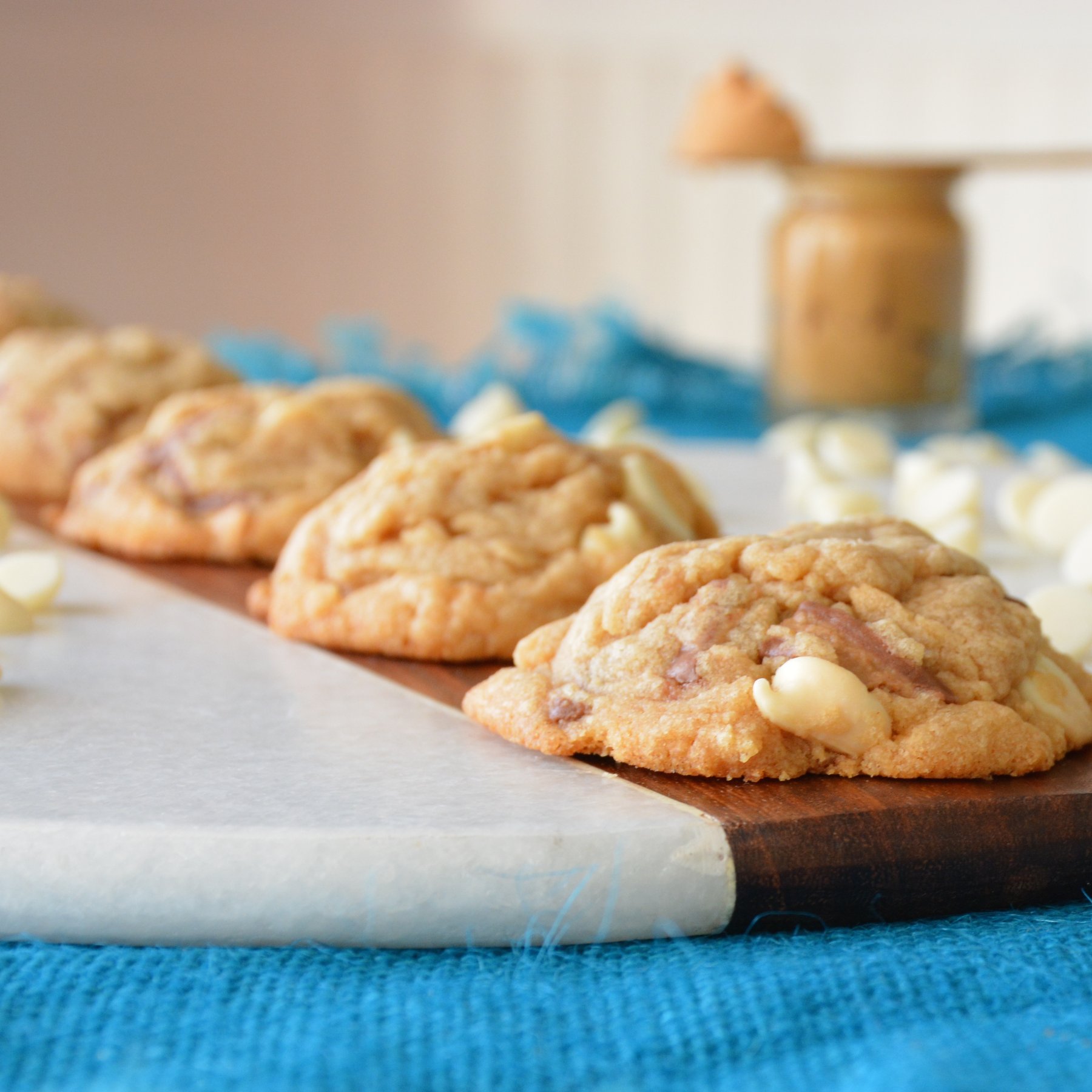 A soft baked chocolate chip cookie that has melted white chocolate and peanut butter in the batter with white chocolate chips AND crushed peanut butter cups!