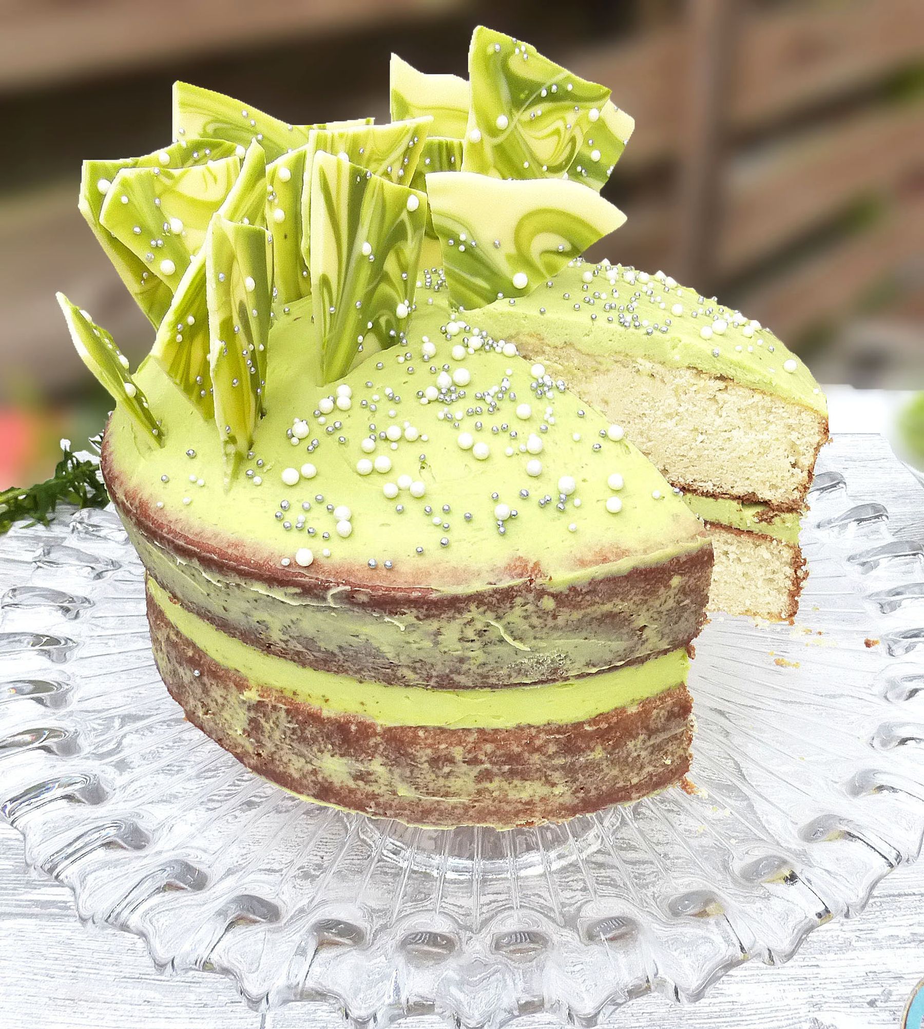 White Chocolate Shard Cake with a White Chocolate Matcha Frosting
