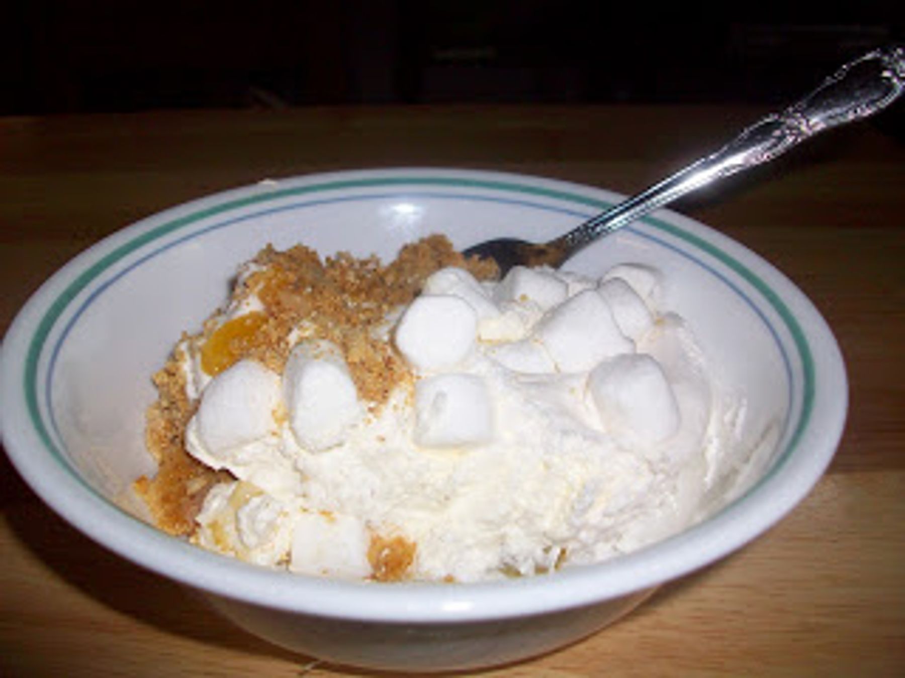 It has a graham cracker crust, fruit, white chocolate pudding, with marshmallows on top.