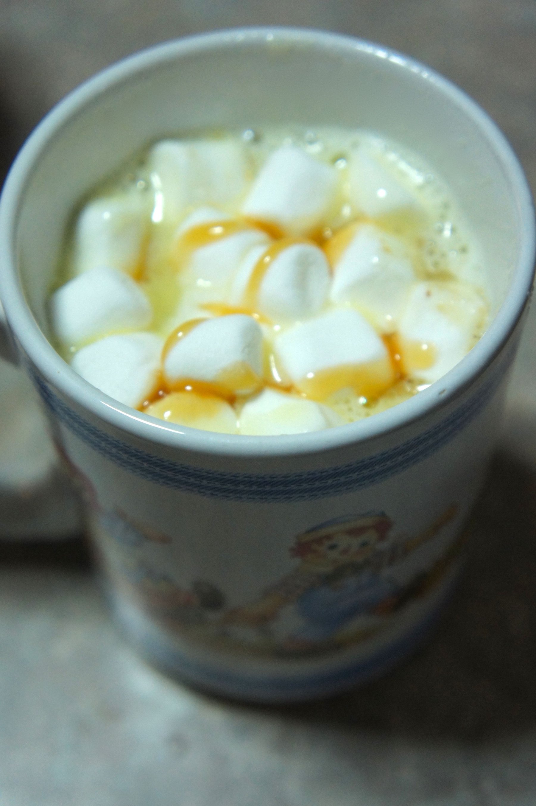 In a medium saucepan bring milk to a boil over medium heat, stirring constantly. Add in the white chocolate and caramel, stir constantly until melted and combined.