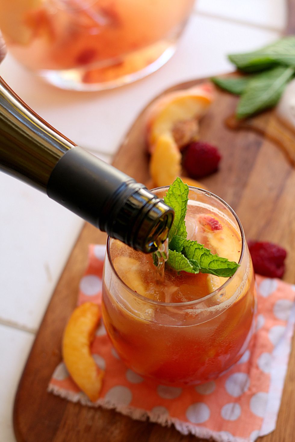 White peach sangria sweetened naturally with fresh berries, peaches and honey. No added refined sugars or syrups for this perfectly sparkling drink!