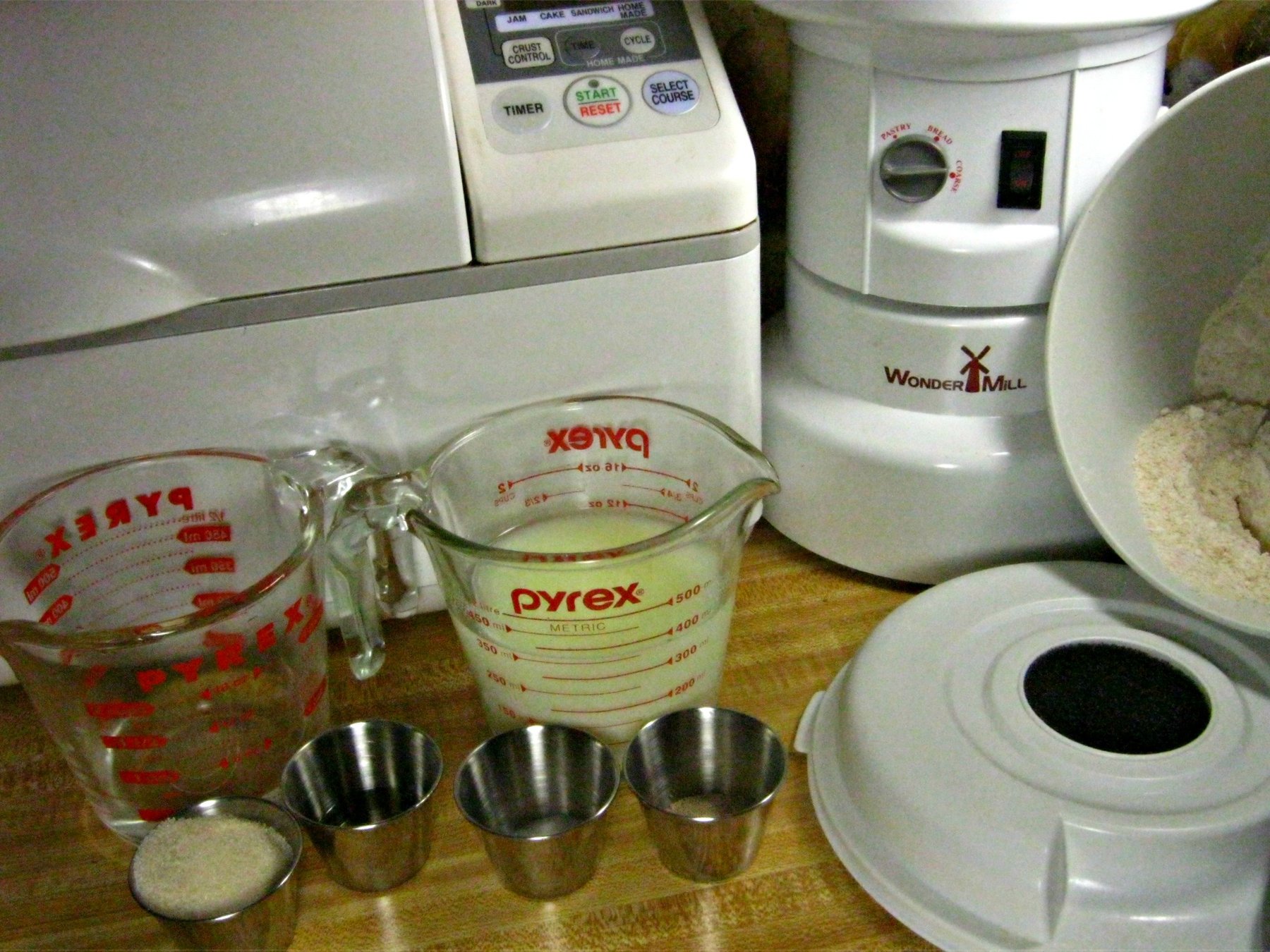 In a separate container combine all dry ingredients (in this case it's simply fresh milled flour and salt). Add 1/2 cup flour mixture to wet mixture and stir to combine. Continue adding until dough is too stiff to stir.