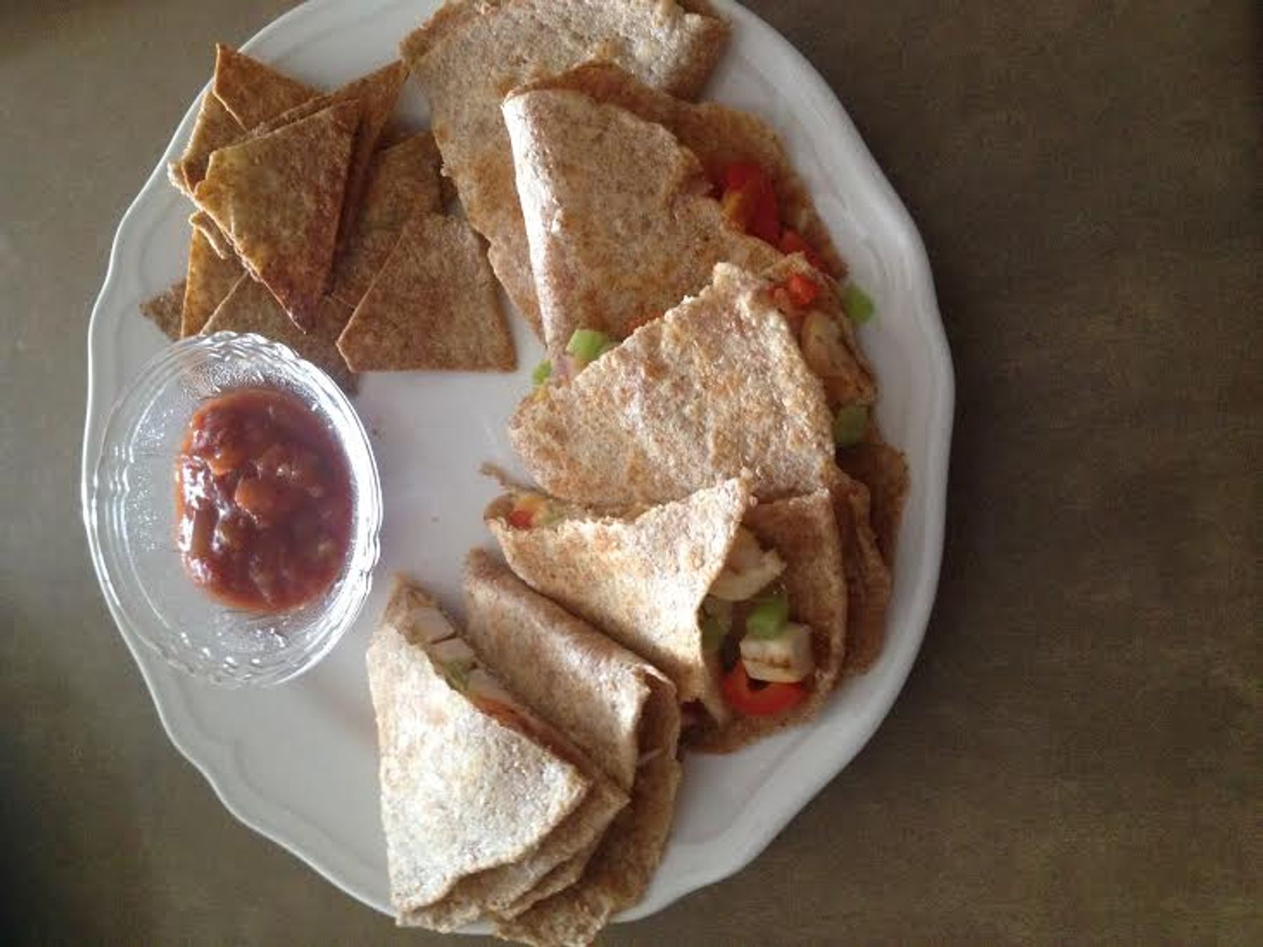 1 chicken breast (cooked and diced), 1/2 red pepper, 1/6th red onion, 2 celery stalks, 4th cup mozz/cheddar low fat cheese blend