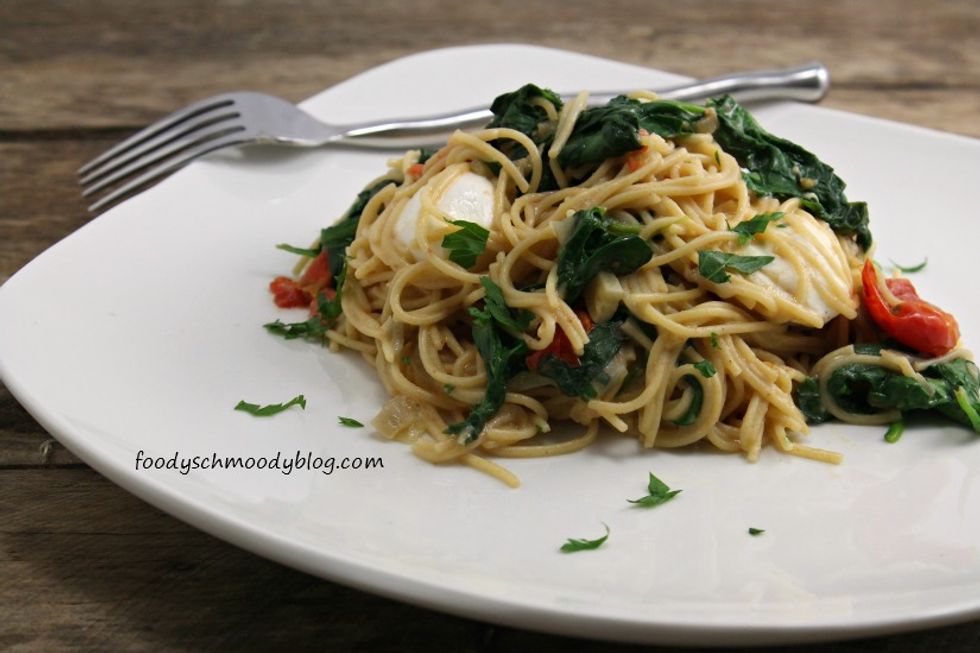 An easy, flavorful alternative to the ordinary pasta night. Whole wheat pasta I paired with caramelized shallots, grape tomatoes, spinach and small balls of mozzarella. If you don't want meatless, just add some precooked chicken.