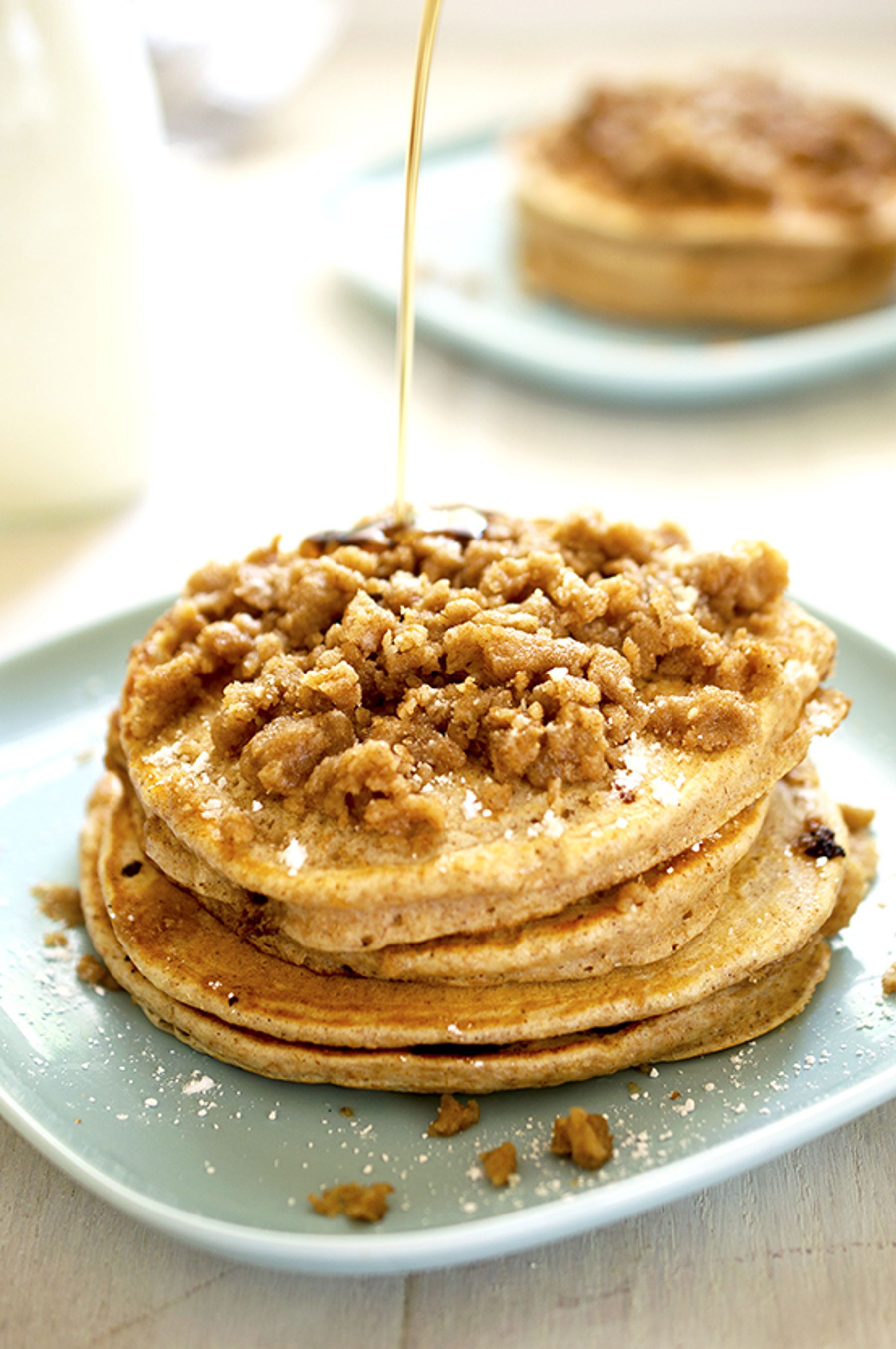 100% Whole Wheat Streusel Pancakes made with Greek yogurt, cinnamon and vanilla. Topped with a buttery cinnamon streusel