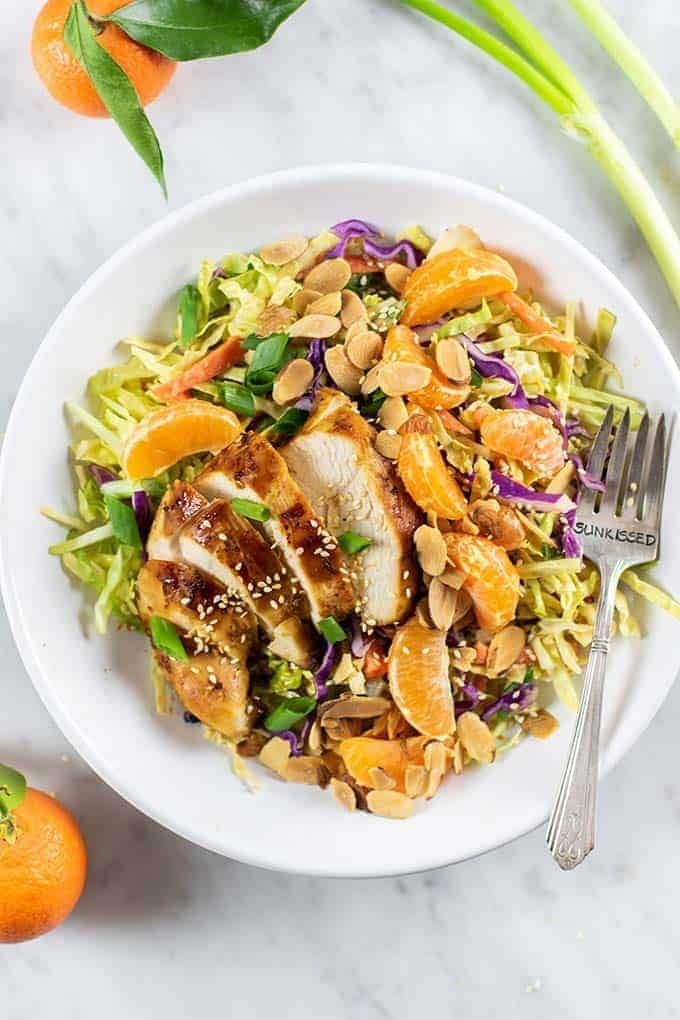 The perfect Whole30 Chinese Chicken Salad, loaded with crunchy cabbage, carrots and toasted almonds. This tangy and sweet salad is made with a creamy sunflower butter dressing, and topped with ginger marinated chicken.