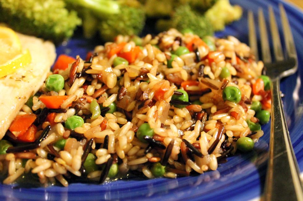 In a large sauce pan Heat oil over medium high heat and sauté onion, and carrot for 5-7 minutes or until the onion becomes translucent. Add rice water and salt to the pan and bring to a boil. Once boiling reduce heat to low, cover and cook for 50 minutes to an hour. The rice should be tender, and water dissipated. You may however need to drain the last little bit. Add peas, pepper and stir to incorporate. Serve with scallions on top.