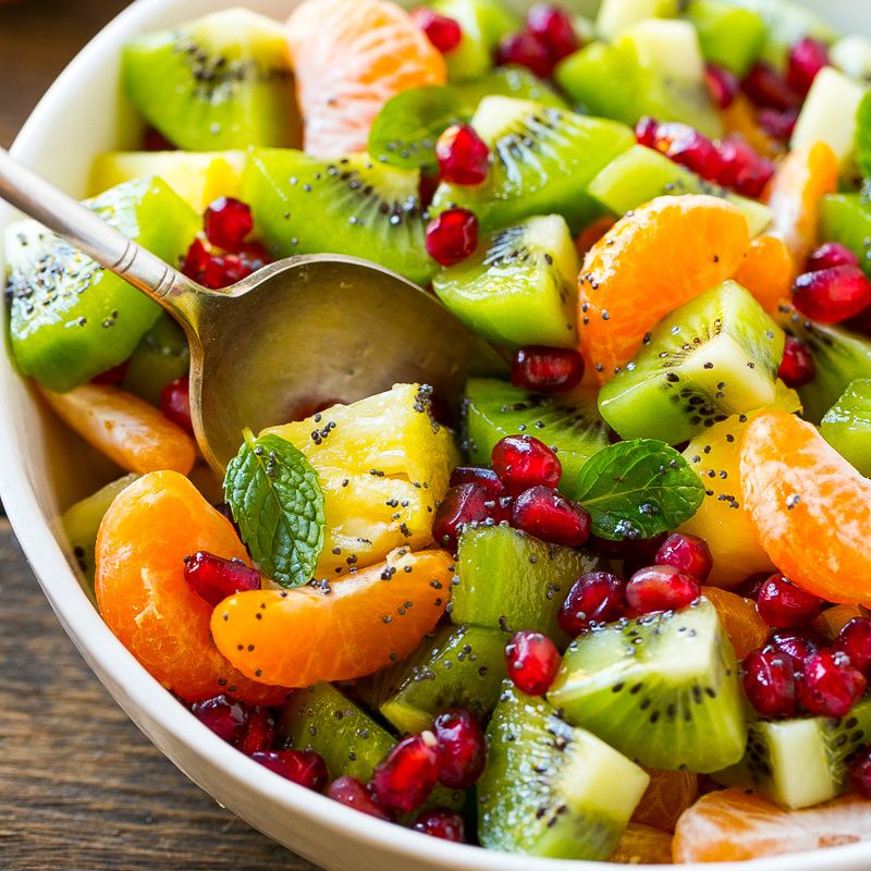 Place the pineapple, kiwi, mandarin oranges and pomegranate arils in a large bowl.