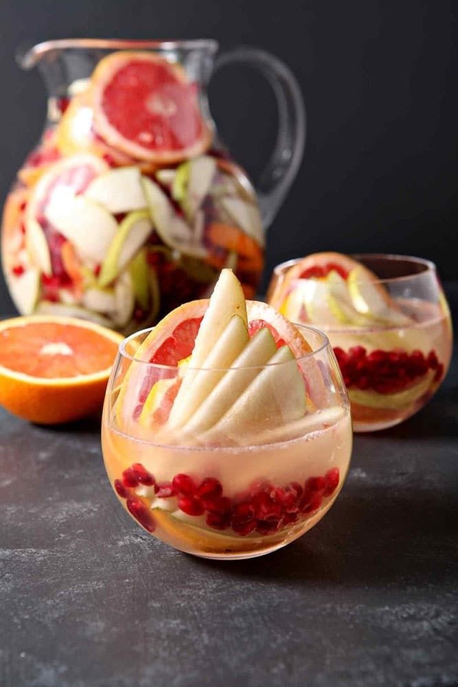 Winter Sangria ~ Full of Pink Grapefruit, Cara Cara or Blood Oranges, Pears and Pomegranates and topped with White Wine and Mint Simple Syrup! This Sangria is Bursting with Flavor!