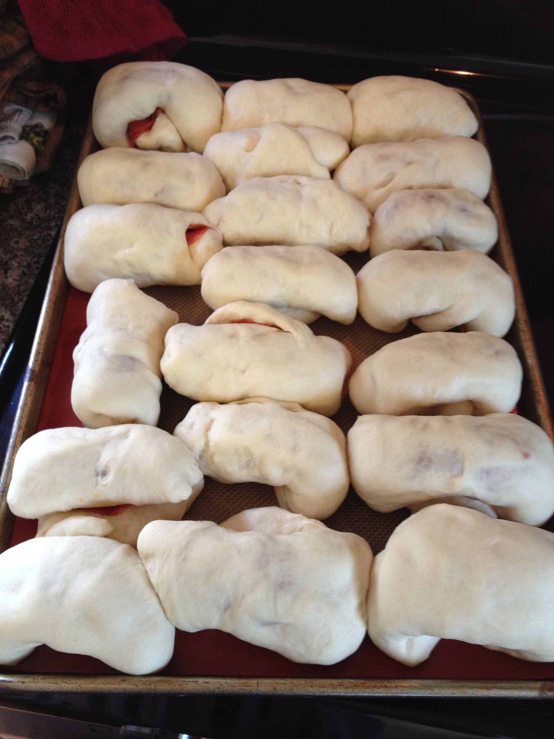 Let bread dough rise in fridge overnight. When the bag is puffed up, cut each loaf into sixths. Flatten each piece and fill with pepperoni. Add any additional toppings or just leave plain. Roll dough...