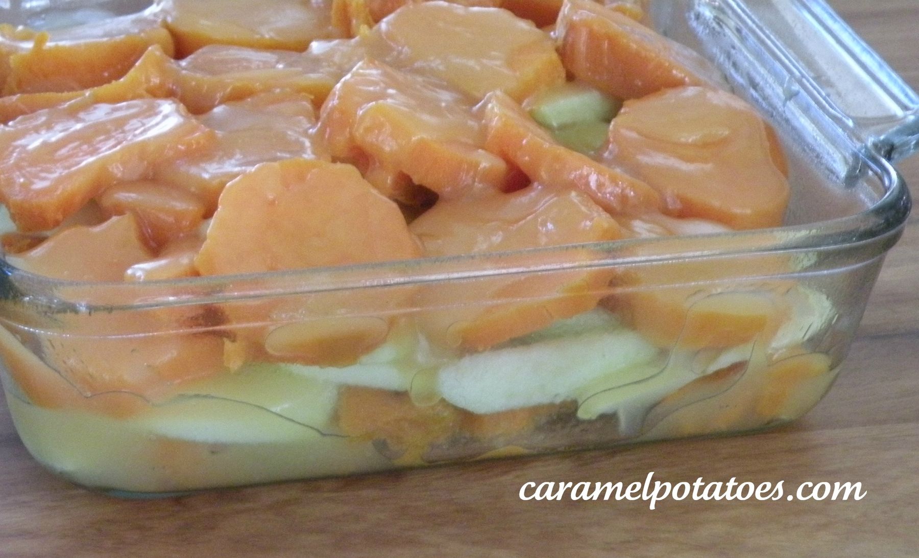 Spray an 8×8 baking dish, layer yams, apples in the middle, then another layer of yams. Pour sauce over the top.