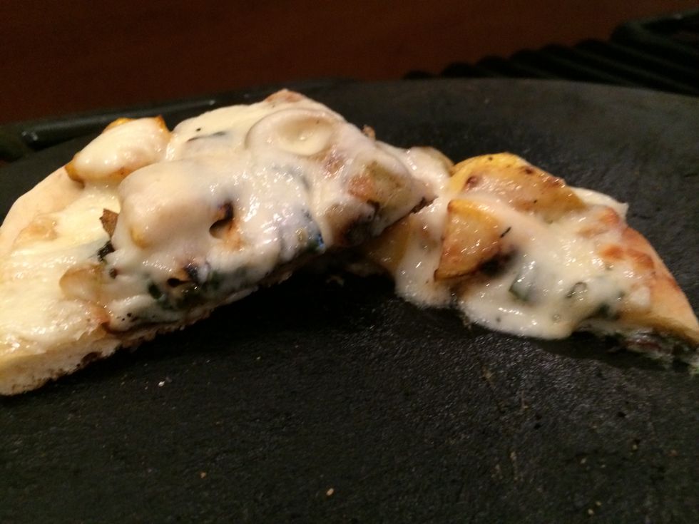 I used the frozen Trader Joe naan bread, so as my chard, onion, and yellow squash were sautéing in a skillet, I heated some olive oil and lightly heated the naan bread as well. Doing this helped to make a crispier base for the pizza.