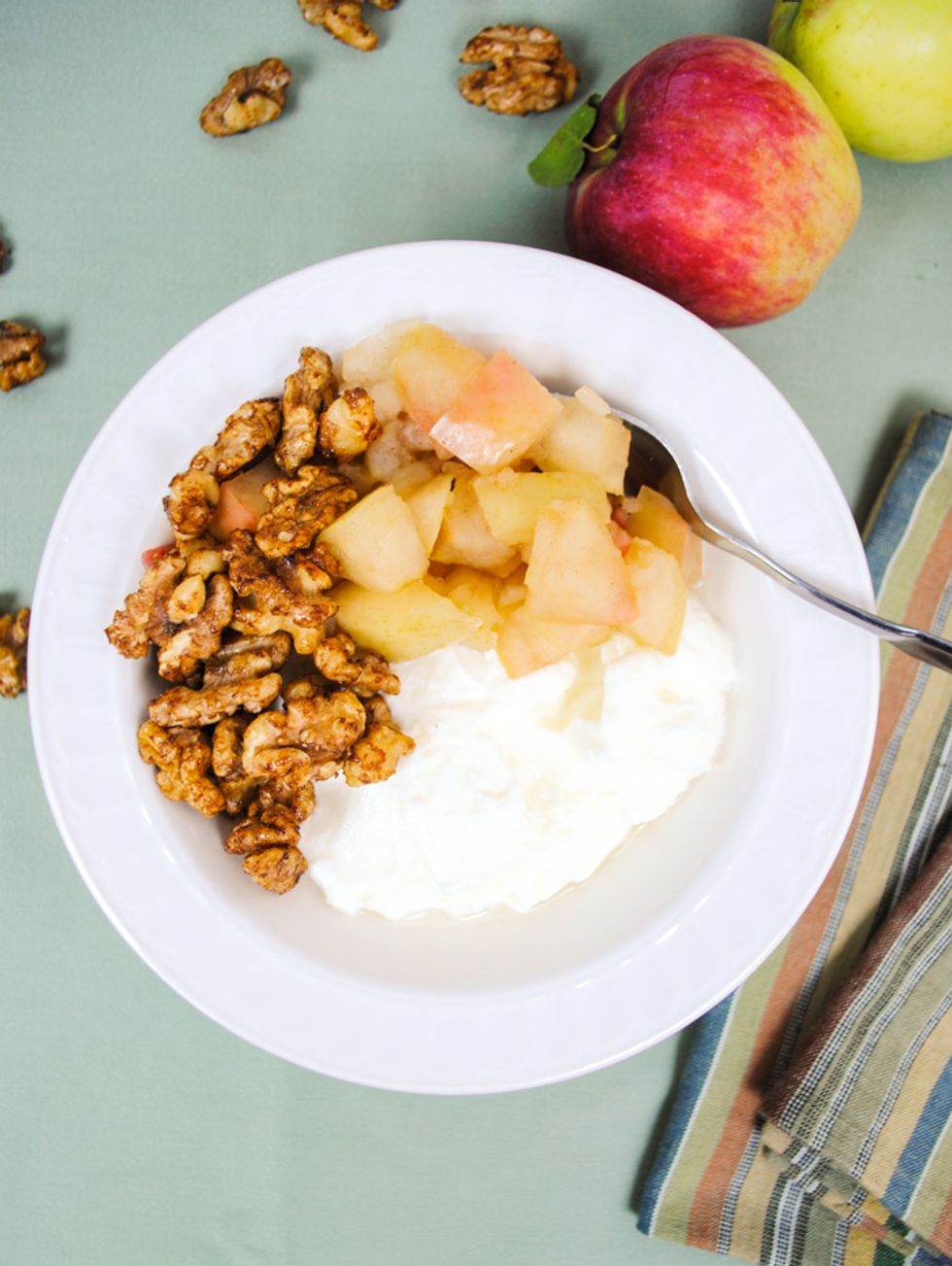 Orchard-fresh apples turn plain Greek yogurt into a morning treat served in these yogurt bowls with crunchy honey toasted walnuts.