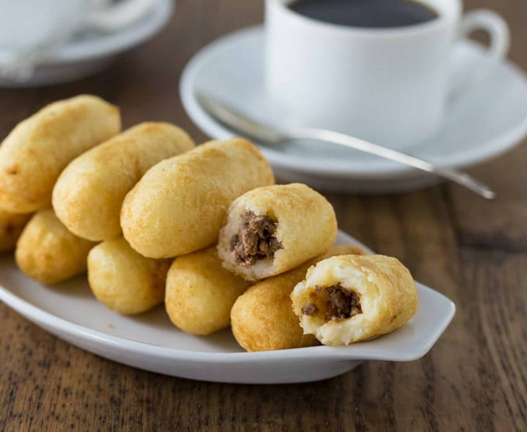 Delicious and easy to make yuca fritters - carimañolas recipe. A favorite in Panama and neighboring Colombia. Carimañolas are stuffed with beef, chicken, or cheese. Great snack! Carimañolas are a yuca dough filled with a tasty spiced meat mixture that is fried into a fritter. Crunchy on the outside, soft on the inside.