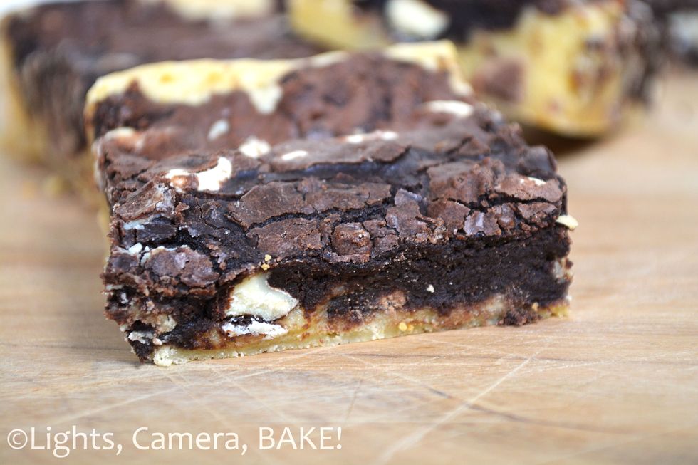 Preheat the oven to 180°C and line an 9"x9" baking tin with baking paper. First make the white chocolate brownie. Melt the butter and white chocolate together. Beat the brown sugar, sugar, egg and vanilla...