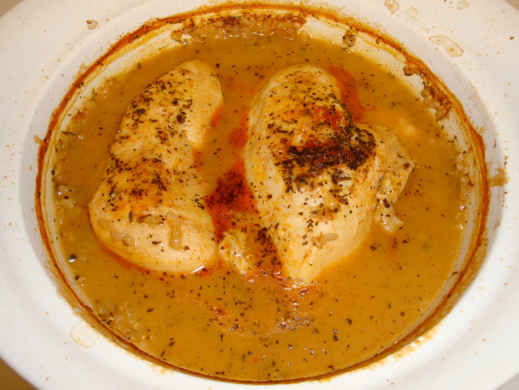 1. Mix soup, water, rice and spices in a shallow baking dish.