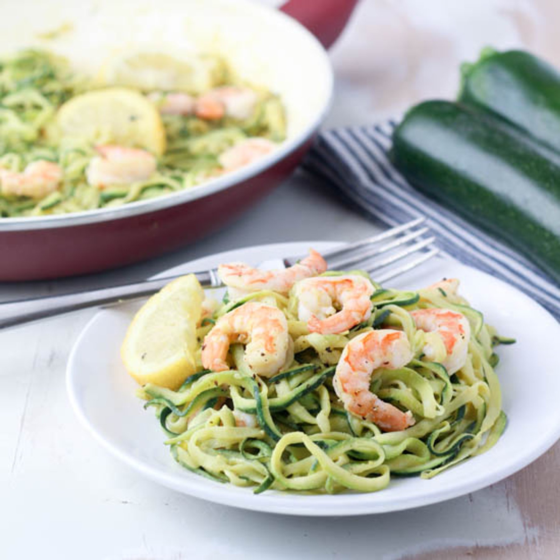 Spiralized zucchini makes a delicious zucchini pasta known as zoodles, a refreshing, healthy way to enjoy creamy lemon shrimp, one pan, and just three ingredients! Gluten Free, Dairy Free, Low Carb