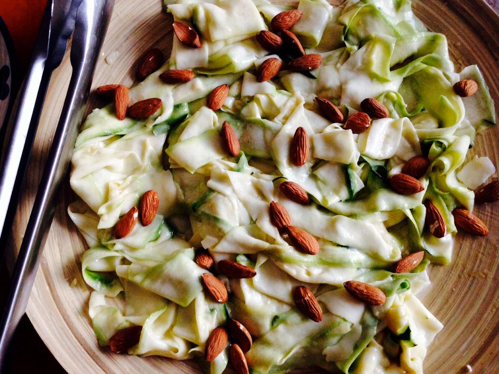 Zucchini, raw almonds and smoked cheese salad in warm honey-tahini dressing.