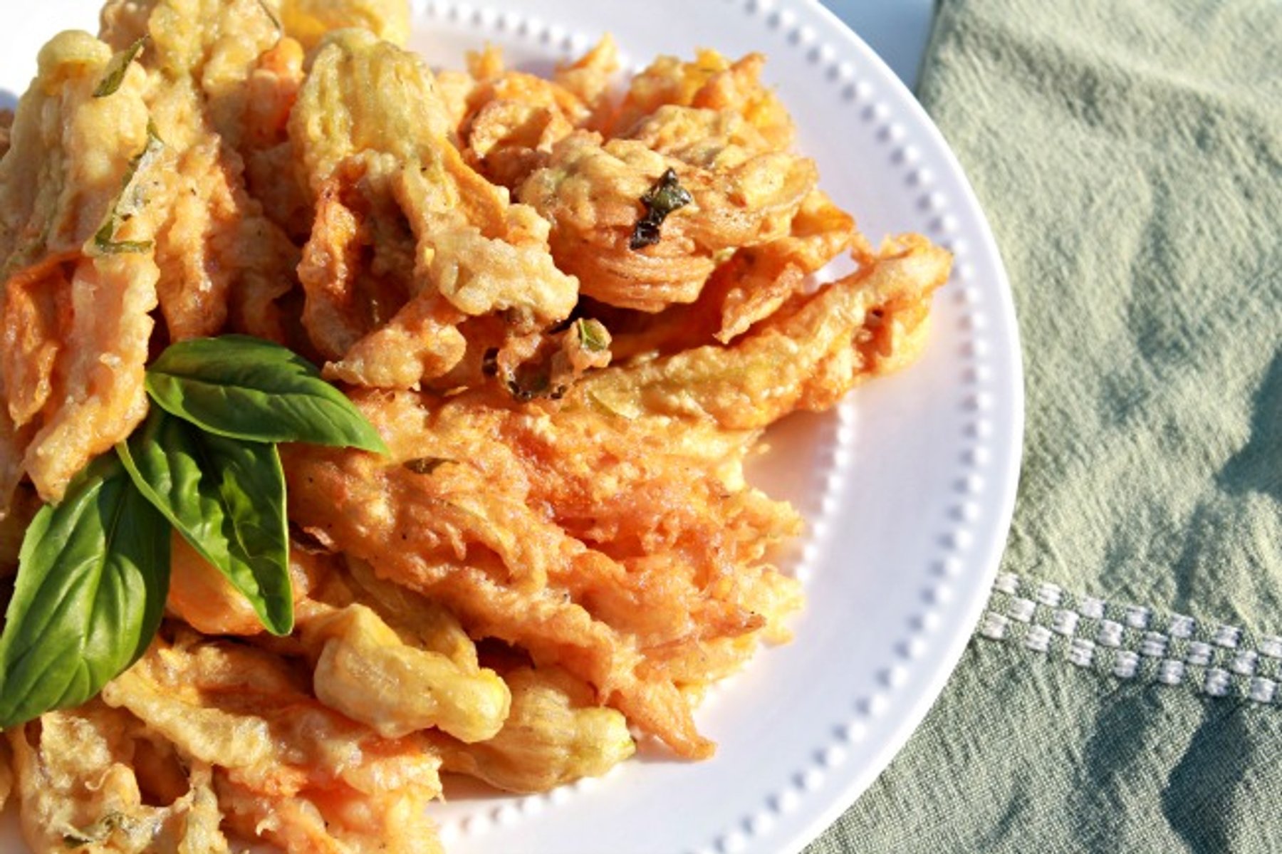 The best part of summer! Beautiful flowers are taken from the zucchini plant, beer battered with fresh basil and garlic and fried into a delicious fritter!