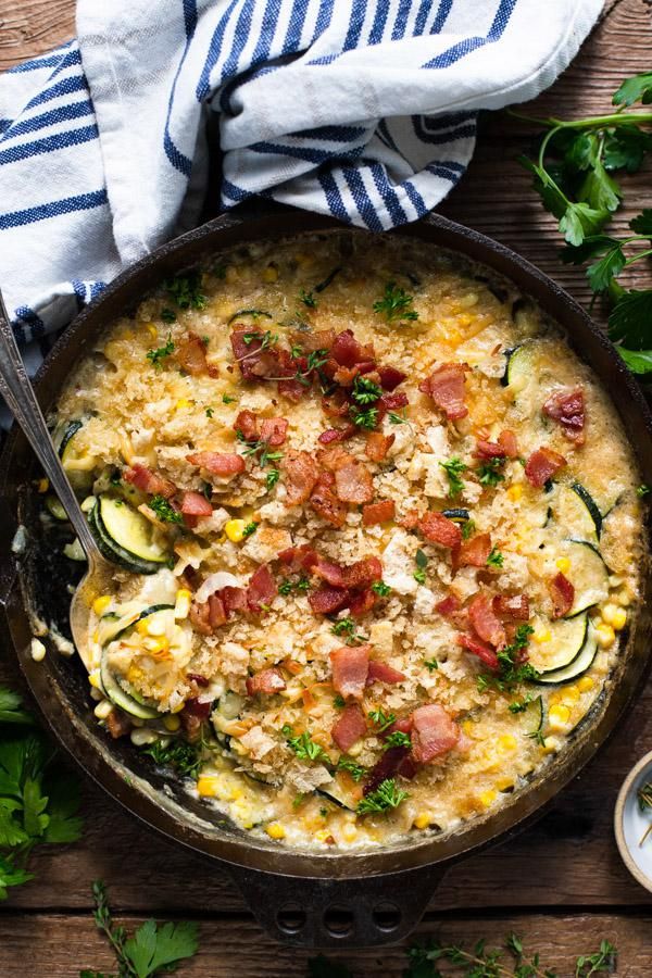 The best dish to shine a spotlight on fresh summer produce! This cheesy Zucchini Gratin includes corn and sweet onions in a creamy sauce, plus gooey Gruyere cheese, crispy bread crumbs, and smoky bacon on top. The easy zucchini casserole is a simple side dish to serve with your favorite grilled chicken, salmon or steak, but it's also flavorful enough to stand on its own as an entrée with a side of crusty bread. If you have a bounty of zucchini in your garden, a delicious zucchini au gratin is the perfect way to enjoy it!