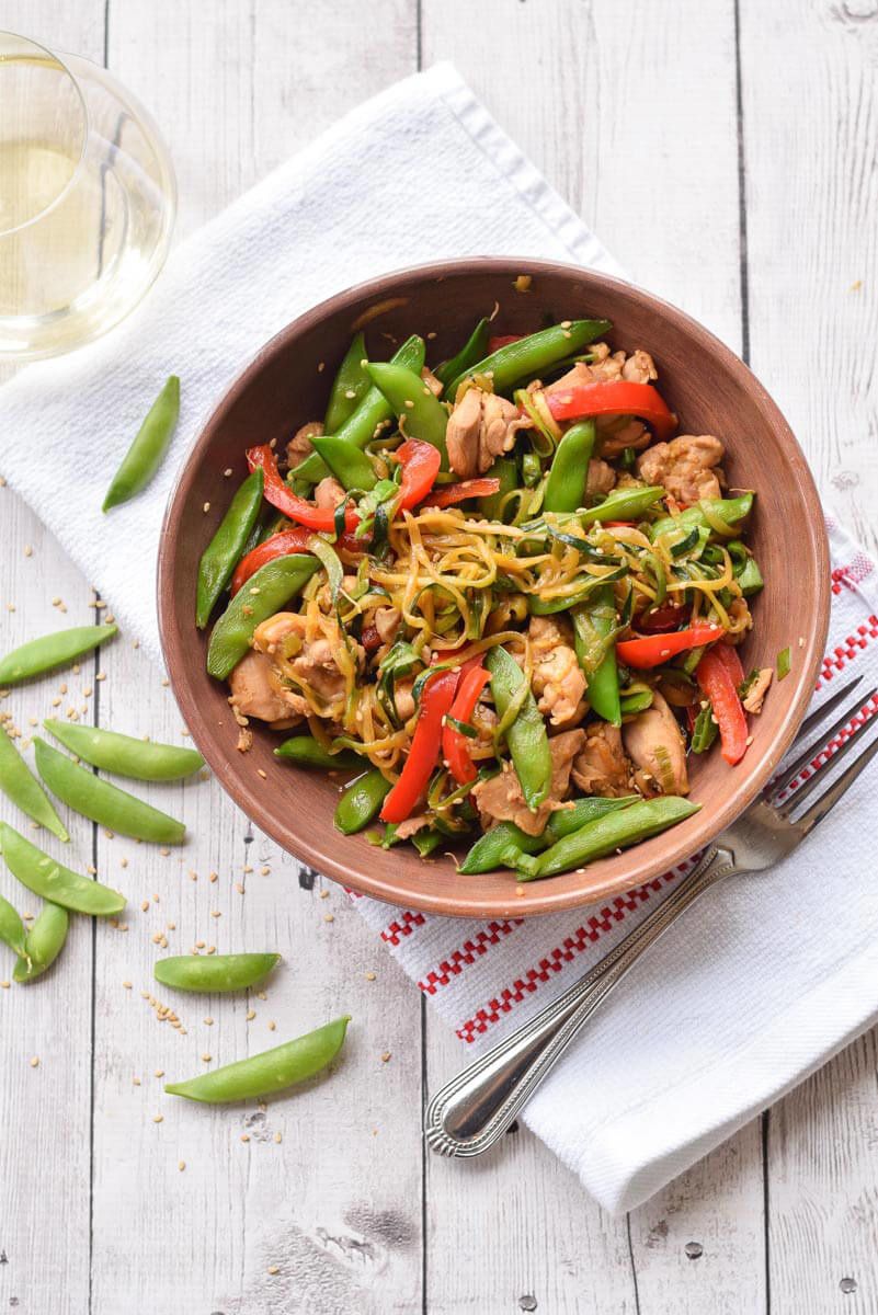 Zucchini Noodle Stir Fry with Chicken and Peppers is a healthy, low carb, gluten free dinner that's ready in less than 30 minutes. Take spiralized zucchini noodles, onions, and peppers and toss them with a delicious stir fry sauce and toasted sesame seeds. {low carb, gluten free}