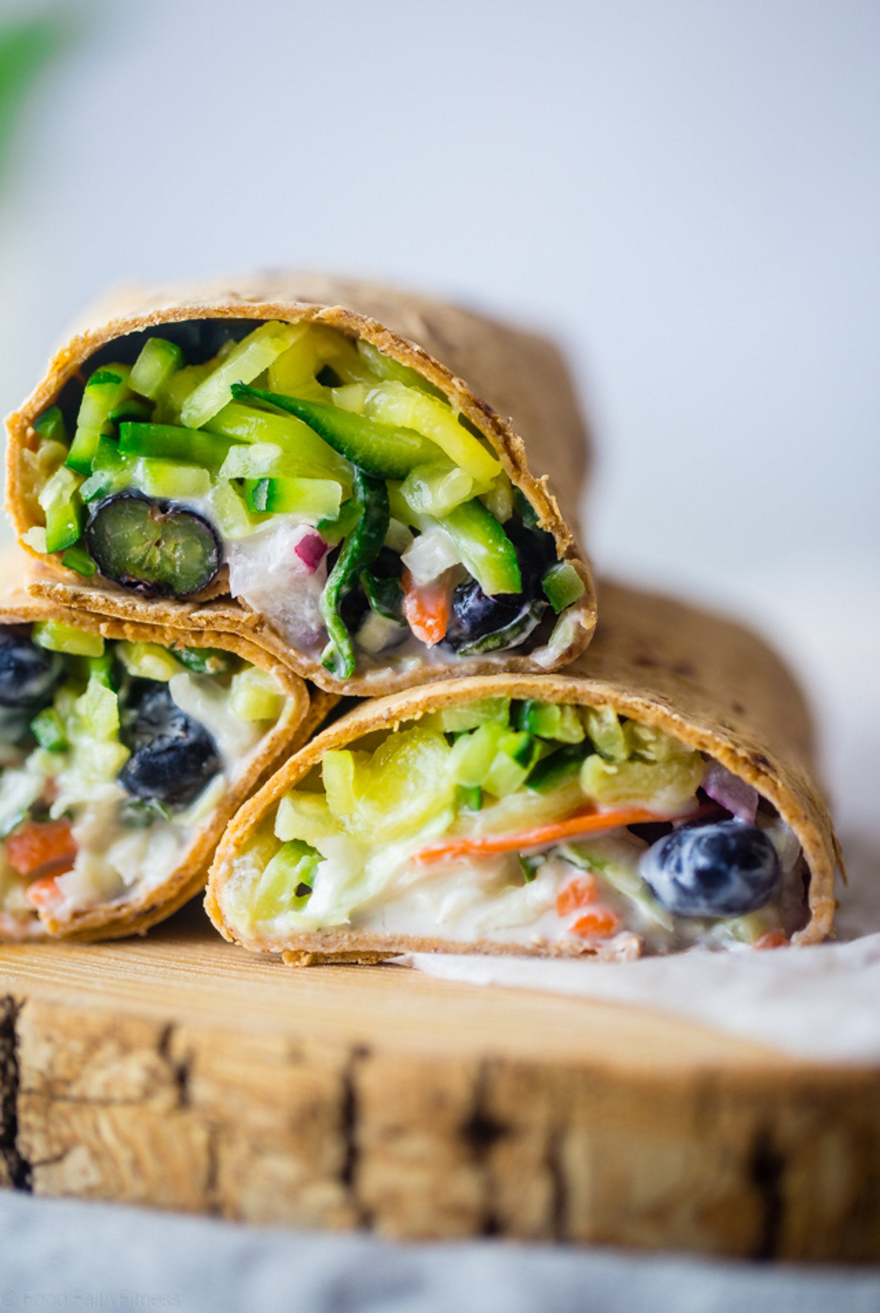 This quick and easy wrap has zucchini noodles, creamy honey lime yogurt dressing and fresh blueberries. It’s a protein-packed, healthy and portable lunch for only 200 calories!