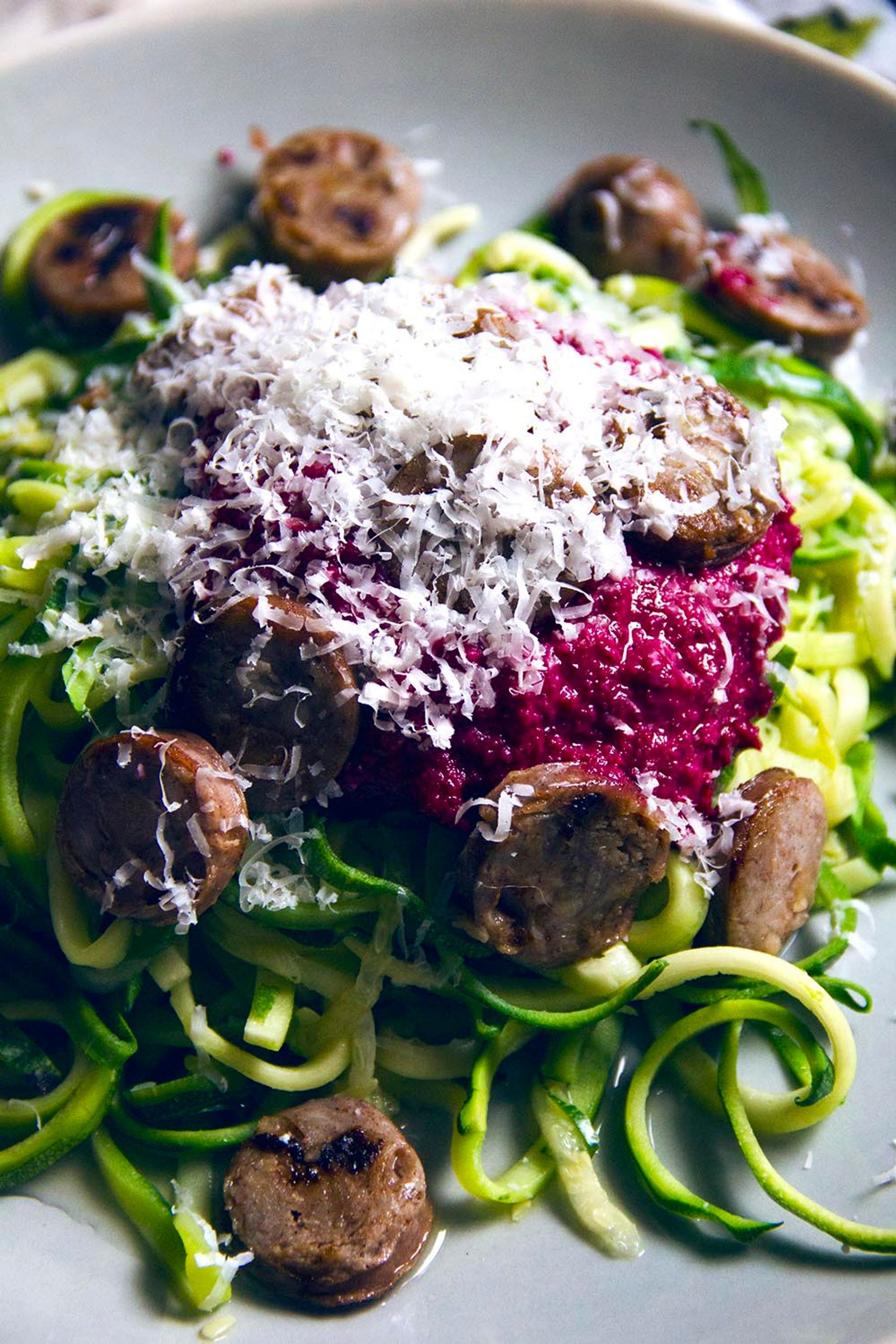 Healthy Zucchini Noodles with a Delicious Beet Pesto Topped with Fried Sausage