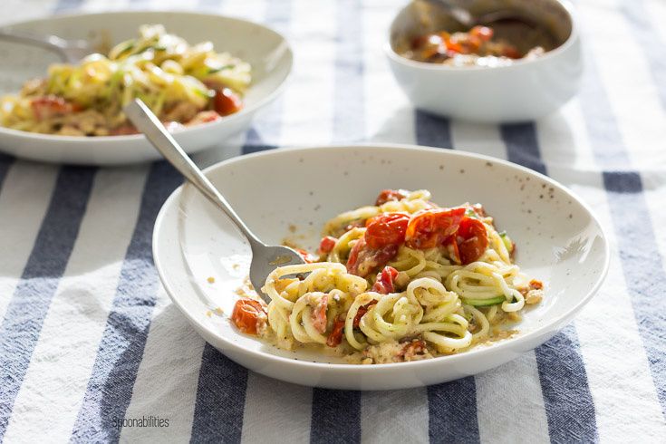 Mediterranean inspired Zucchini Noodles with artichoke lemon pesto. This healthy recipe is easy and quick to make in under 30 minutes. Add in a touch of summer with roasted cherry tomatoes, and top it off with fresh asiago cheese.