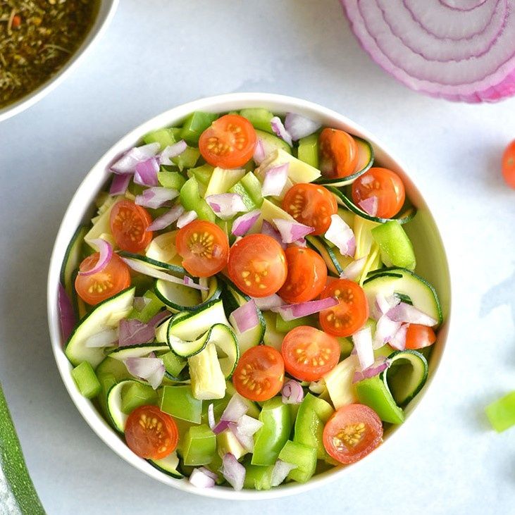 Paleo Zucchini Pasta Salad! Replace pasta with spiralized zucchini for a light, refreshing and filling pasta salad! A low carb pasta salad filled with vegetables. Pair with your favorite lean protein for a complete meal. Low Carb + Gluten Free + Paleo + Low Calorie + Vegan