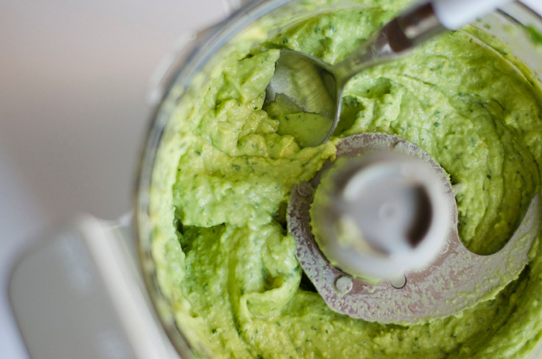 Sauteed zucchini pasta with creamy avocado and basil pesto.