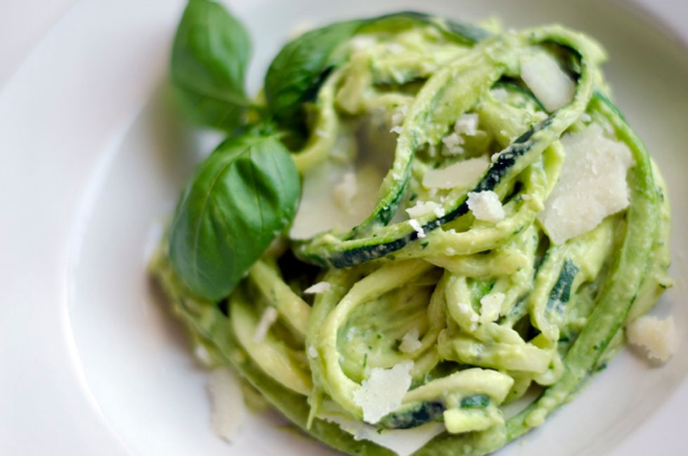 Sauteed zucchini pasta with creamy avocado and basil pesto.