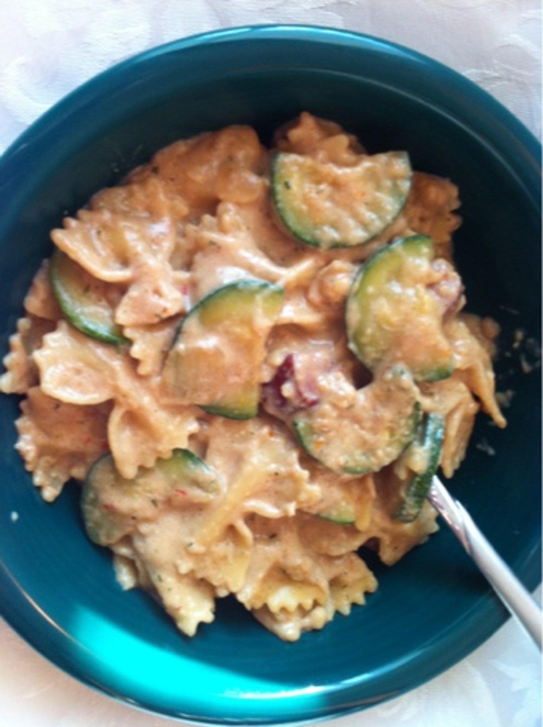 In a large pan, lightly saute the sausage and zucchini together for about five minutes, just until the zucchini started to brown. Set aside.